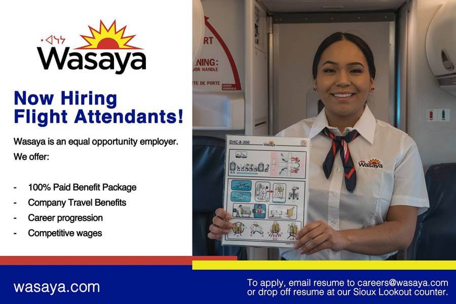 You must be fluent in English to become a Wasaya Airways flight attendant. That said, fluency in French and other languages is a bonus. Being fluent in Oji-Cree or Ojibway is also an asset.